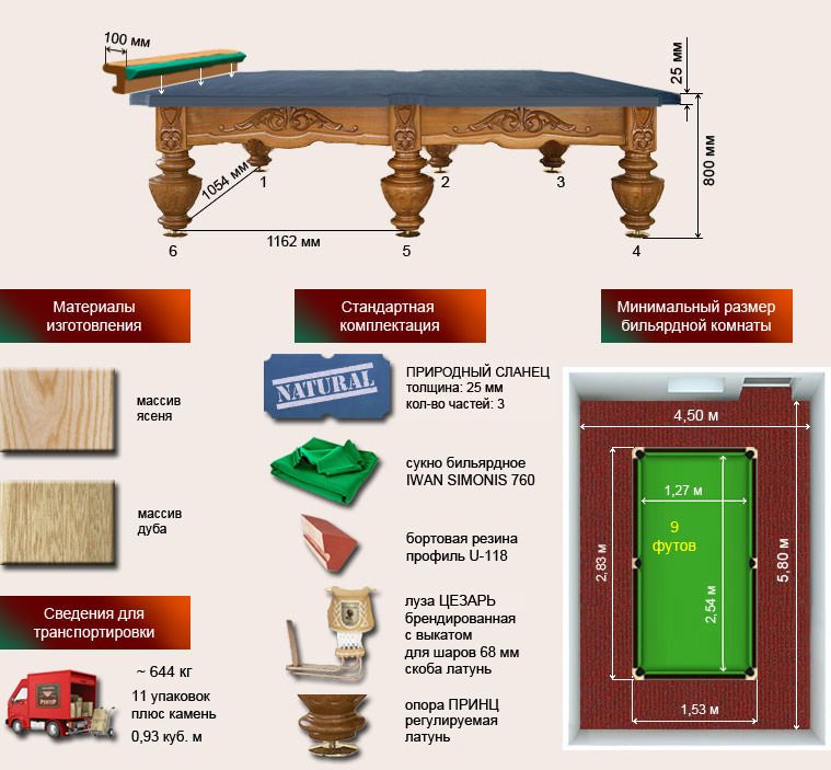 Бильярдный стол для русской пирамиды "Цезарь" (9 футов, дуб, сланец 25мм)