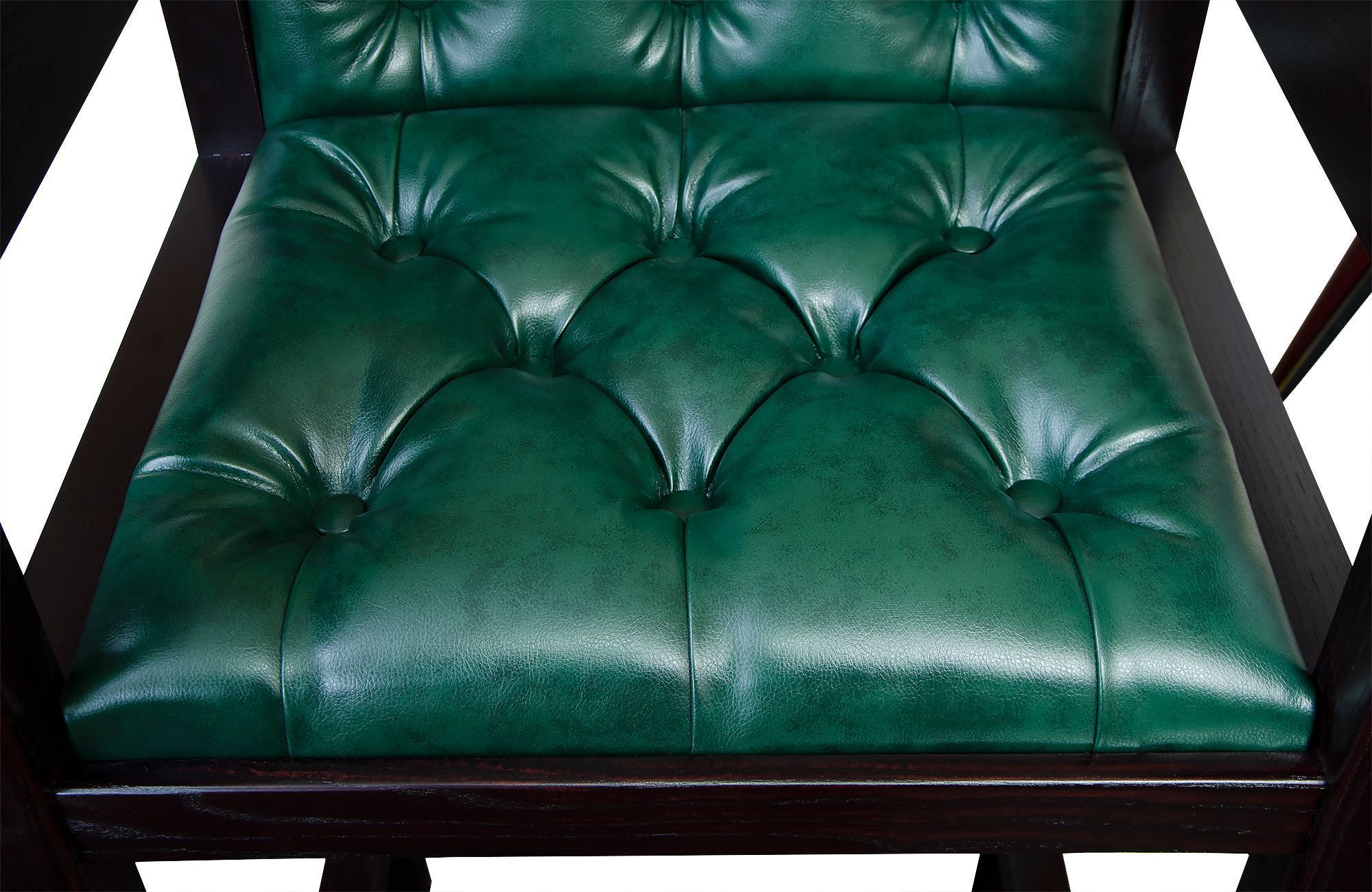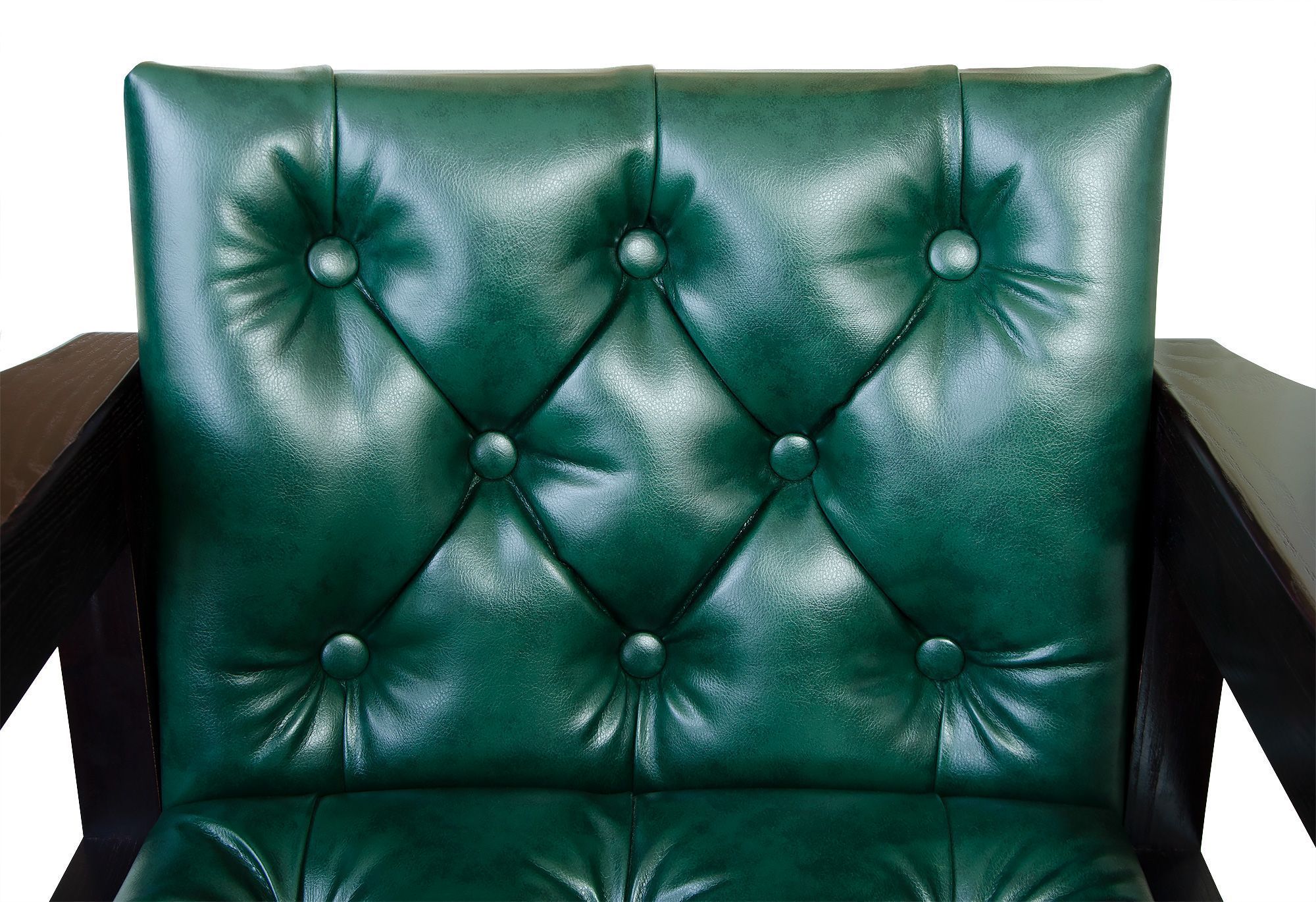 - Роскошная обивка. Мягкие сиденье и спинка обиты практичной и износостойкой искусственной кожей насыщенного изумрудно-зеленого цвета. Декоративная «каретная стяжка» не только выглядит эффектно, но и добавляет комфорта, создавая объем и мягкость.
