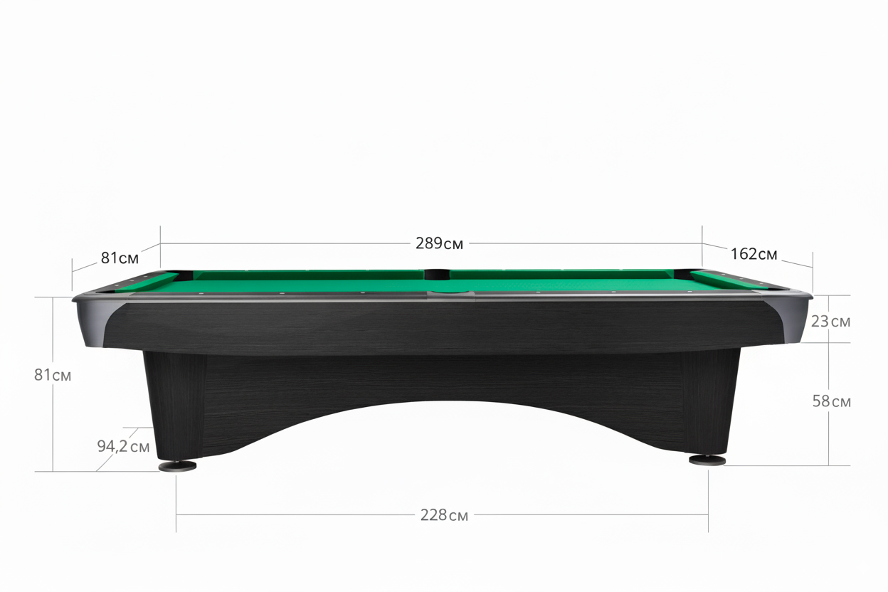 Размеры игрового поля составляют 254 х 126 см, а габаритные размеры стола - 289 х 162 х 83 см.