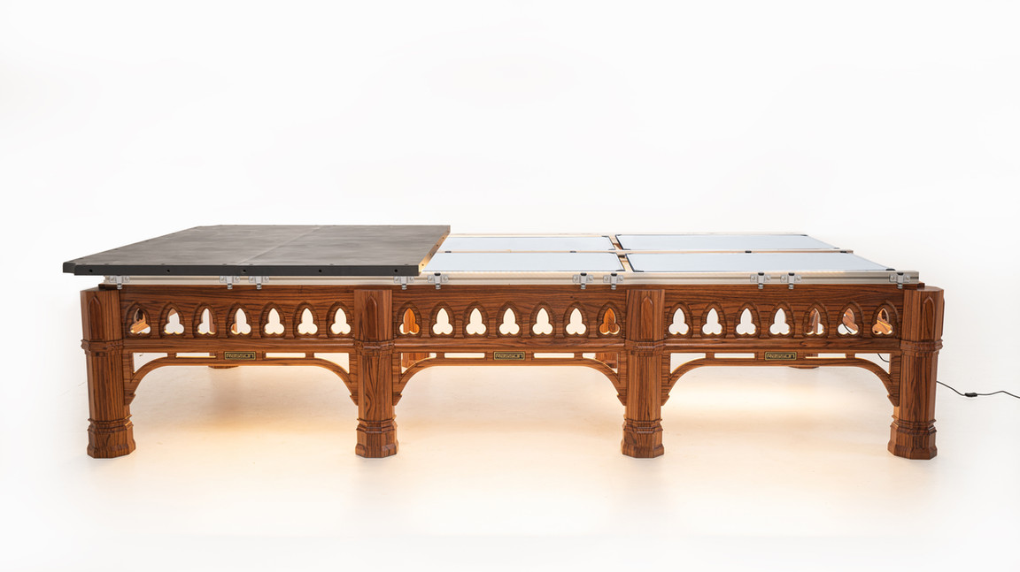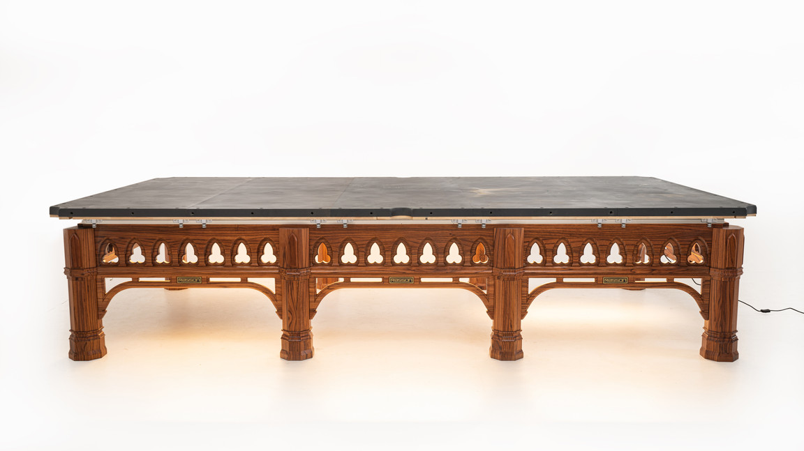 Стол Gothic Dynasty вдохновлен архитектурными элементами готики, что находит отражение в строгих линиях и изящных деталях. Борта и каркас стала изготовлены из массива древесины экзотической породы дерева - Эбиара (происхождение: Габон, Африка). Сегодня Эбиара уже запрещена к вырубке в некоторых африканских странах и занесена в Красную книгу, поэтому является редкой и дорогой древесиной. Это дерево имеет высокую плотность, Эбиара тверже дуба и бука, её плотность в среднем от 700 до 720 кг/м³. Перед обработкой дерево проходит 12-летний цикл естественной сушки, что позволяет достичь оптимальной влажности.