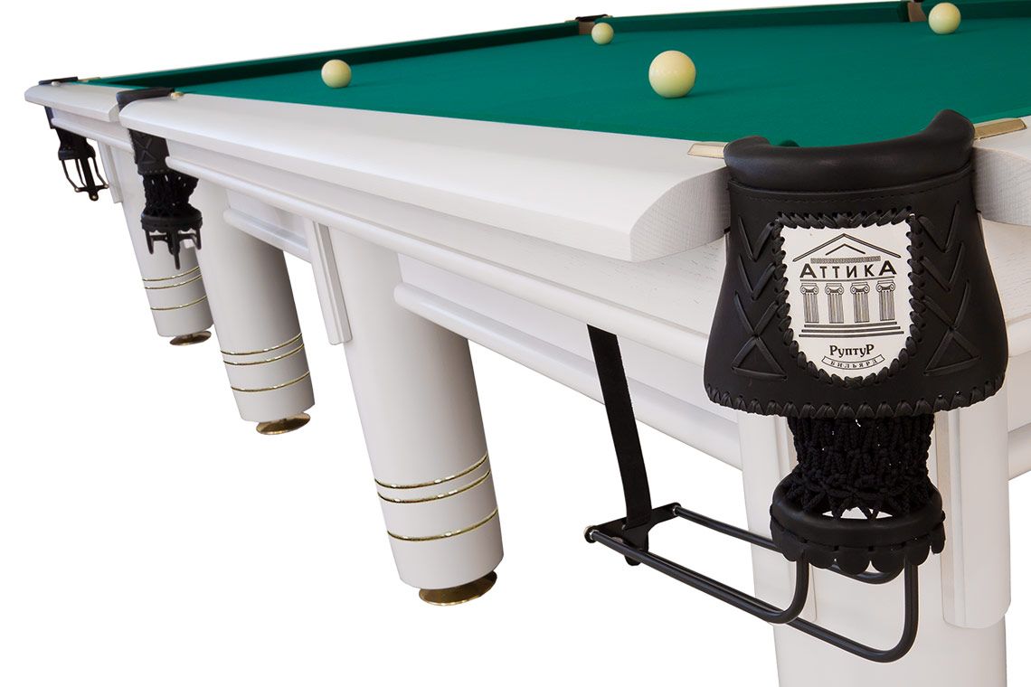 На ваш выбор – любой оттенок бильярда из нашей палитры, но мы рекомендуем кроме белоснежного, цвет 22/4 – темный с серебряными кольцами на ногах. В белом же цвете деревянные поверхности стола «Аттика» имеют удивительное сходство с мрамором, лучшие сорта которого добывают в одноименном регионе Греции. Отборный массив дуба, ясеня или ольхи — материалы, гарантирующие прочность и долговечность стола даже при самых интенсивных спортивных нагрузках. Выбор материала изготовления обеспечивает покупку оптимального по стоимости оборудования. Для приобретения доступны киевница и светильник «Аттика» в таком же стиле.