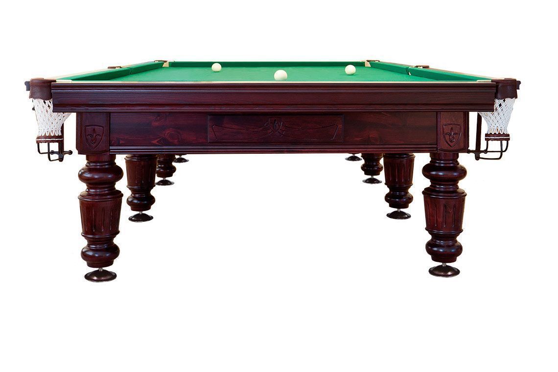 Стол «Шевалье» один из самых ярких представителей своей серии. Его конверты и царги лафета покрыты резьбой с элементами, стилизованными под старинный дворянский герб. Ноги из отборного массива сосны с легкостью несут мощный сосновый каркас и плиты натурального сланца. При этом они выглядят весьма грациозно за счет точеного рельефа и вертикальных резных канавок. Прочные опоры ног, борта из ясеня, лузы с кожаными пелеринами, качественное сукно — недорогая стандартная комплектация оптимальна для организации домашнего бильярда.