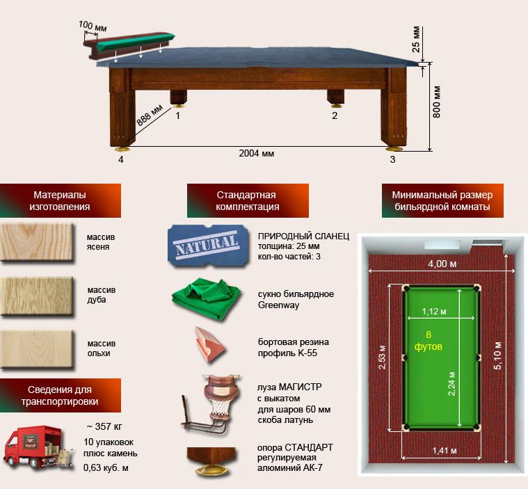 Спецификация бильярдного стола «Спортклуб» 8 футов: