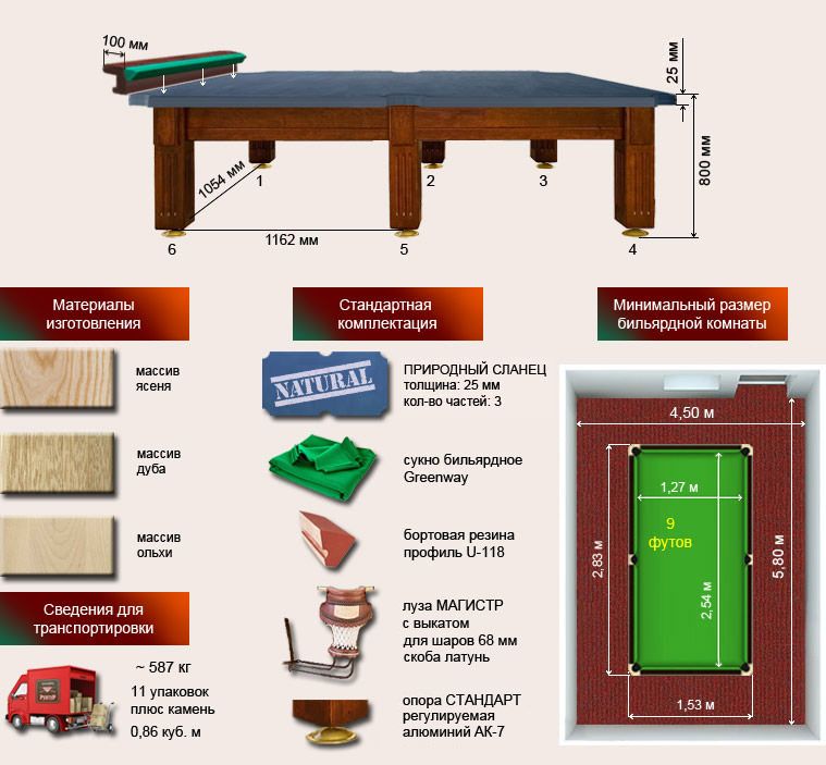 Спецификация бильярдного стола «Спортклуб» 9 футов: