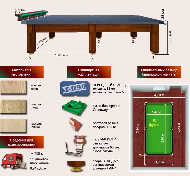 Спецификация бильярдного стола «Спортклуб» 10 футов: