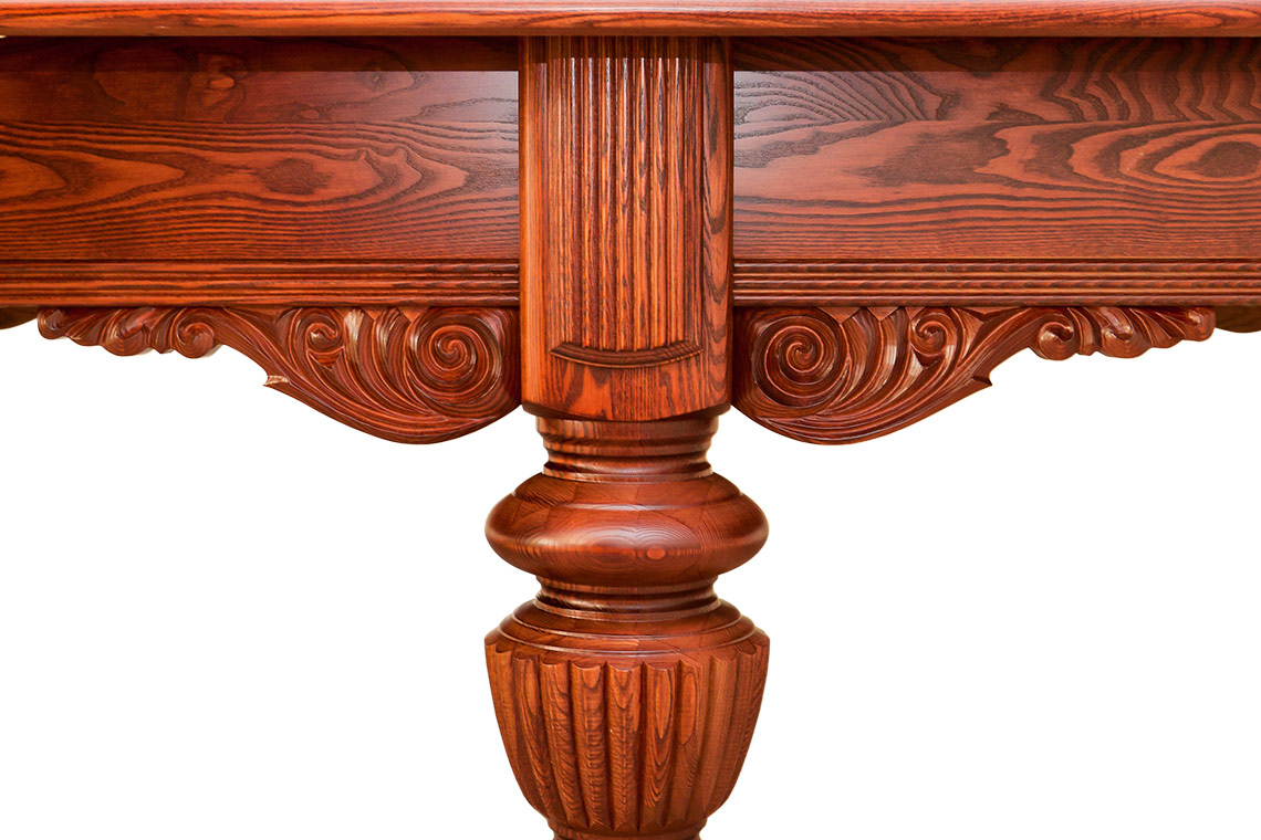 - Изысканный дизайн ручной работы. Массивные ноги стола украшены богатой художественной резьбой и изящными каннелюрами. Эти декоративные элементы превращают стол из спортивного снаряда в предмет искусства. Несмотря на свою основательность, конструкция выглядит утончённо и подчёркивает природную эстетику дерева.