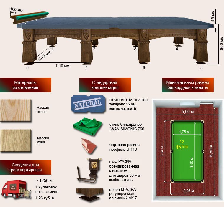 Спецификация бильярдного стола «Русич» 12 футов: