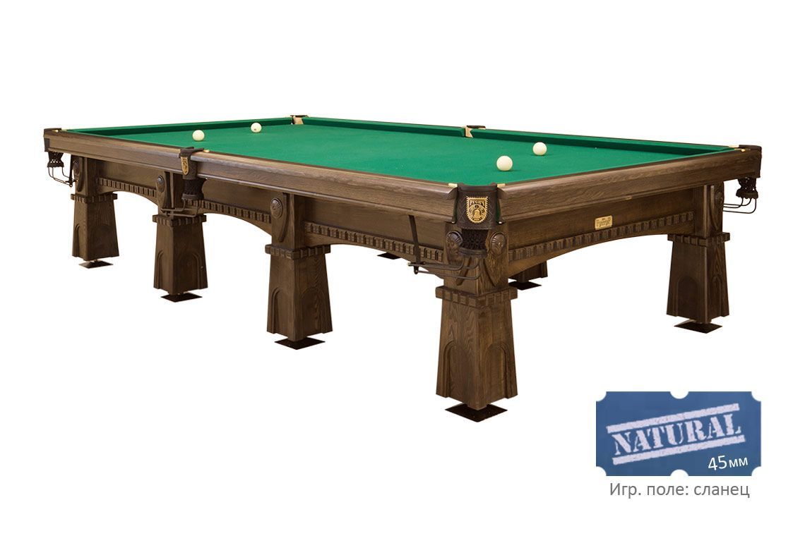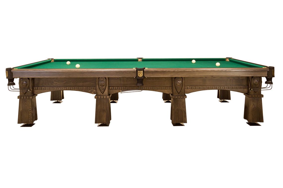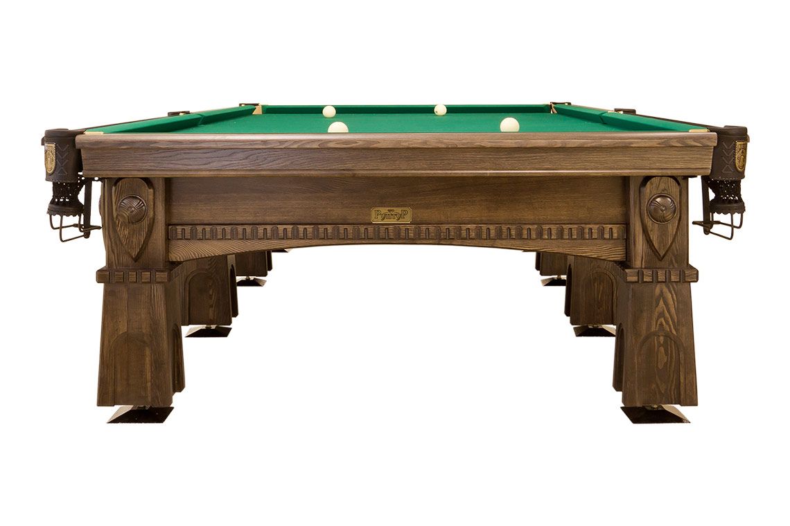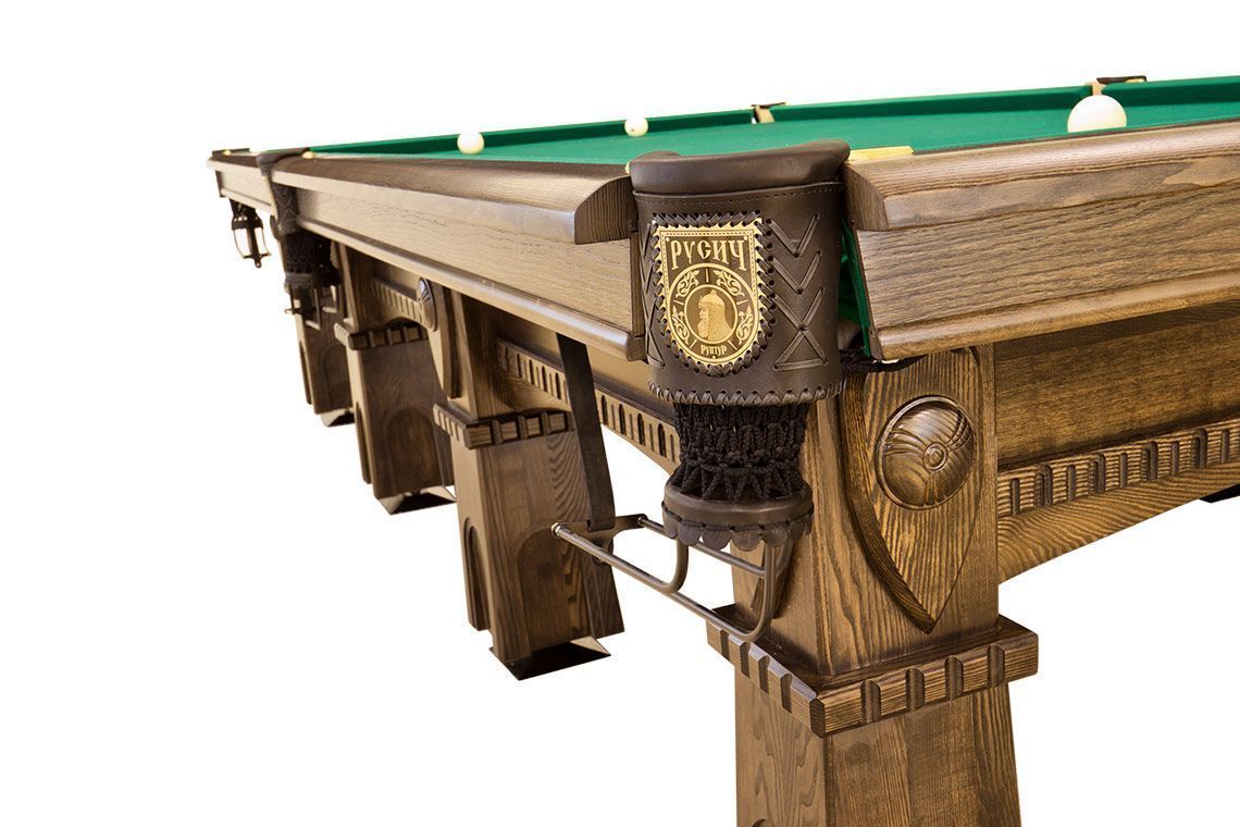 Кожаные пелерины луз венчает изображение витязя. На конвертах ног находится его щит с родовым гербом в виде резьбы ручной работы. Высушенный по специальной технологии массив дерева и выносливые сланцевые плиты — отборные материалы, благодаря которым стол «Русич» будет радовать не одно поколение игроков.