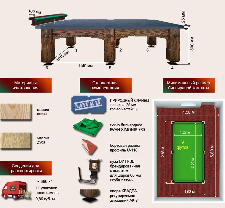 Спецификация бильярдного стола «Витязь-Премиум» 9 футов: