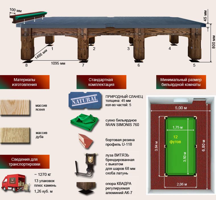 Спецификация бильярдного стола «Витязь-Премиум» 12 футов: