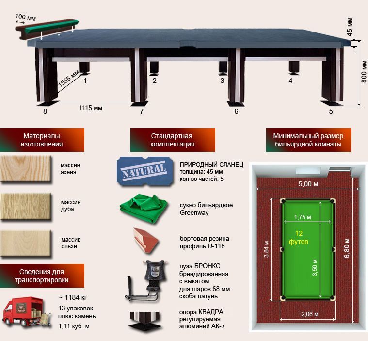 Спецификация бильярдного стола «Бронкс-Премиум» 12 футов: