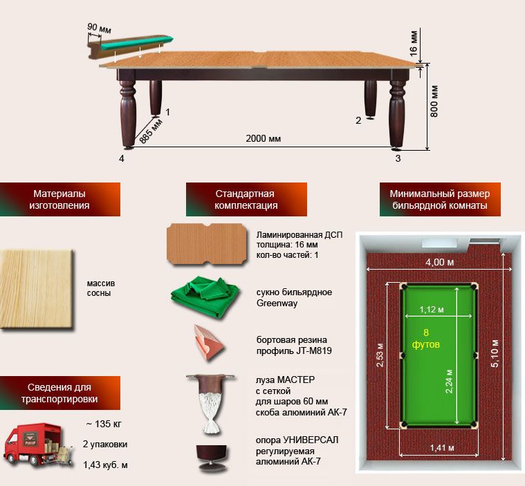 Спецификация бильярдного стола «Юниор» 8 футов: