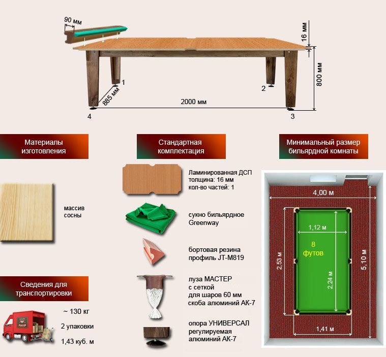 Спецификация бильярдного стола «Мастер» 8 футов: