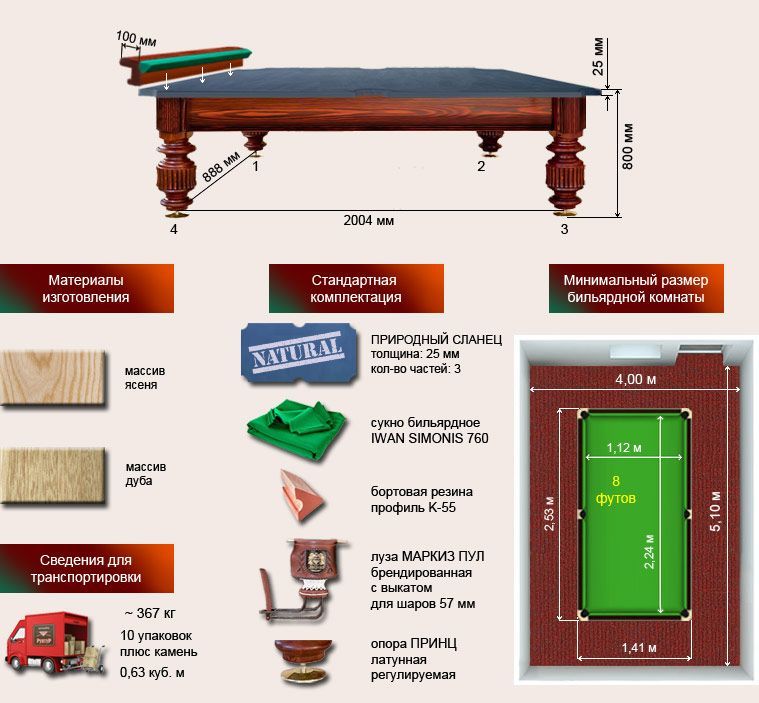 Спецификация бильярдного стола «Маркиз» 8 футов: