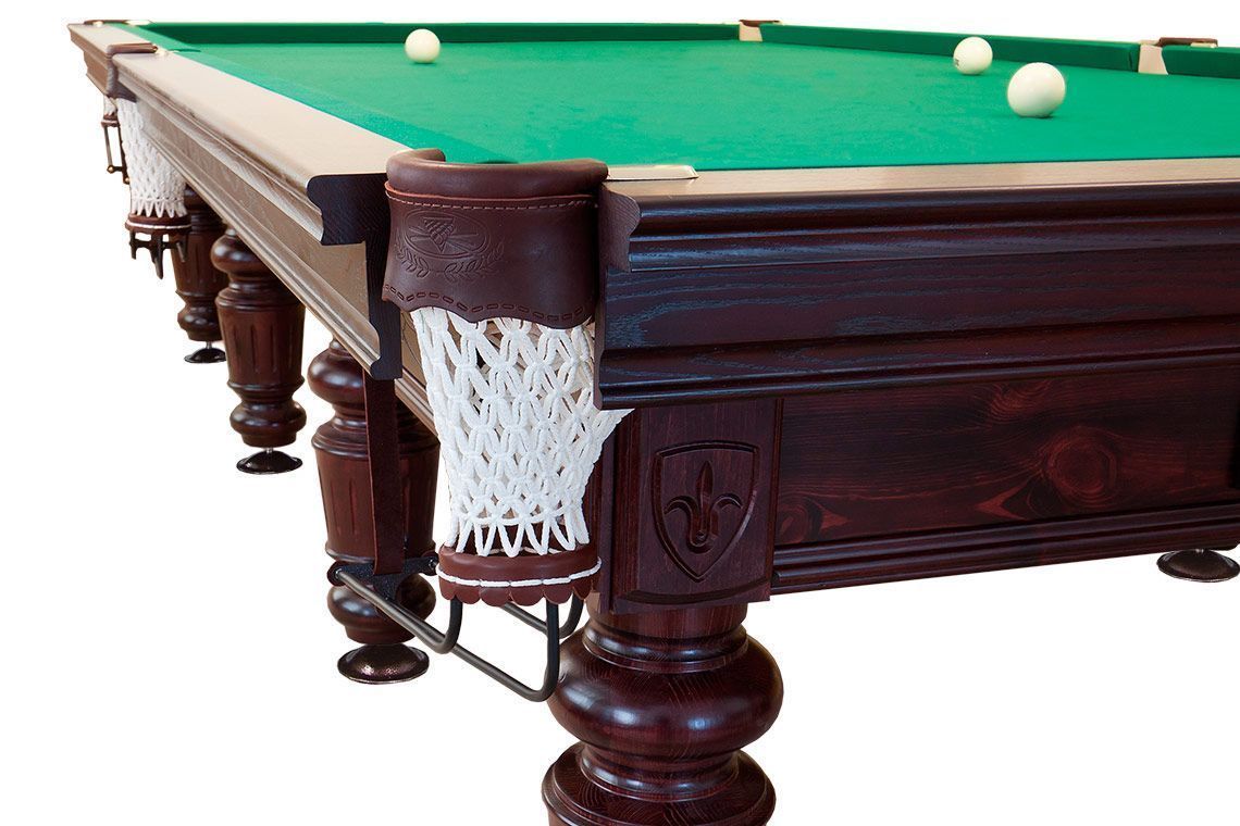 Стол «Шевалье» один из самых ярких представителей своей серии. Его конверты и царги лафета покрыты резьбой с элементами, стилизованными под старинный дворянский герб. Ноги из отборного массива сосны с легкостью несут мощный сосновый каркас и плиты натурального сланца. При этом они выглядят весьма грациозно за счет точеного рельефа и вертикальных резных канавок. Прочные опоры ног, борта из ясеня, лузы с кожаными пелеринами, качественное сукно — недорогая стандартная комплектация оптимальна для организации домашнего бильярда.