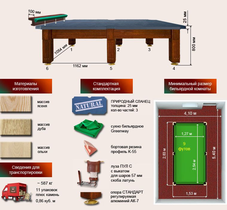 Спецификация бильярдного стола «Спортклуб» 9 футов:
