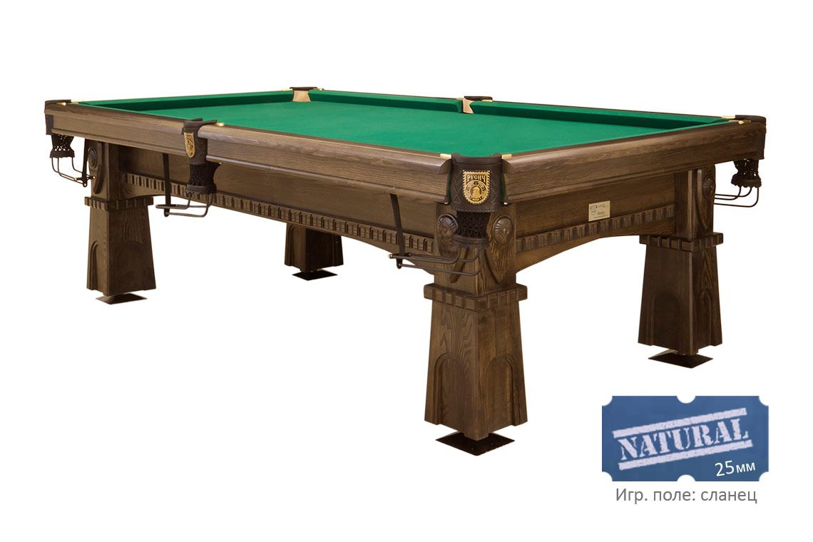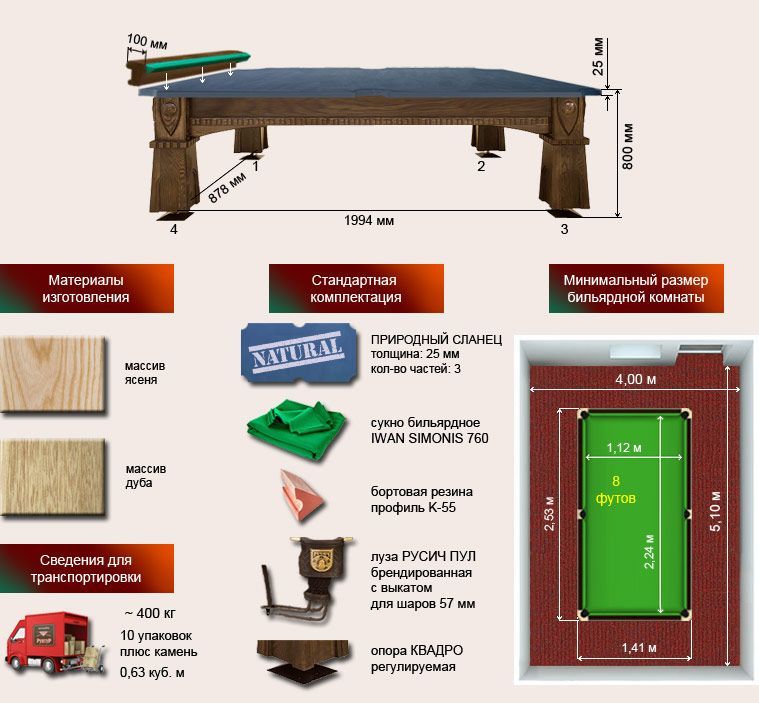 Кожаные пелерины луз венчает изображение витязя. На конвертах ног находится его щит с родовым гербом в виде резьбы ручной работы. Высушенный по специальной технологии массив дерева и выносливые сланцевые плиты — отборные материалы, благодаря которым стол «Русич» будет радовать не одно поколение игроков.