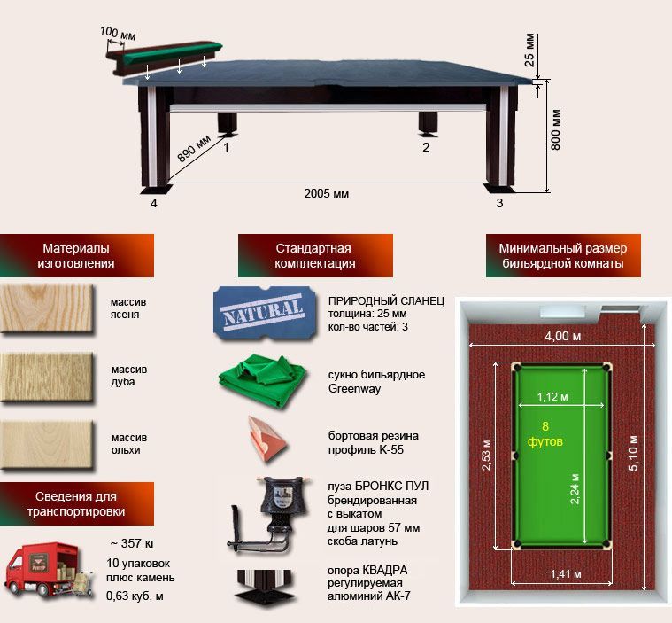 Спецификация бильярдного стола «Бронкс-Премиум» 8 футов: