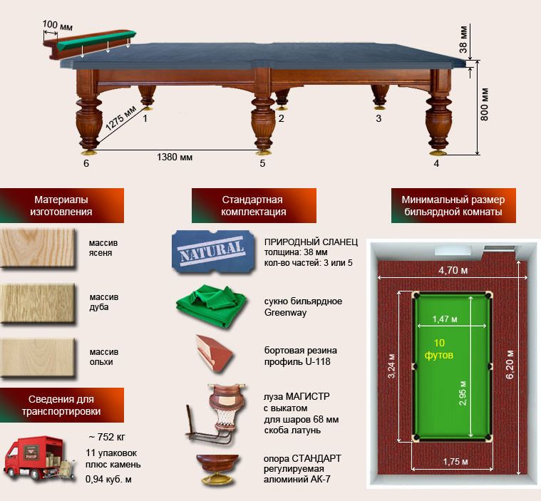 Спецификация бильярдного стола «Аттика» 10 футов: