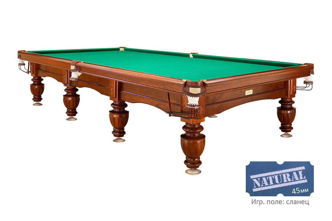 Стол «Шевалье» один из самых ярких представителей своей серии. Его конверты и царги лафета покрыты резьбой с элементами, стилизованными под старинный дворянский герб. Ноги из отборного массива сосны с легкостью несут мощный сосновый каркас и плиты натурального сланца. При этом они выглядят весьма грациозно за счет точеного рельефа и вертикальных резных канавок. Прочные опоры ног, борта из ясеня, лузы с кожаными пелеринами, качественное сукно — недорогая стандартная комплектация оптимальна для организации домашнего бильярда.