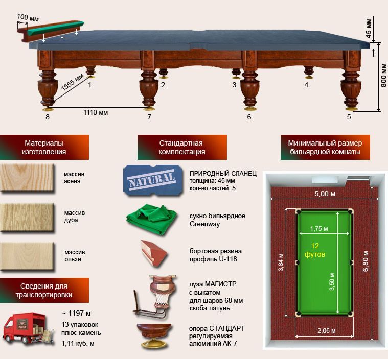 Спецификация бильярдного стола «Шевалье» 12 футов: