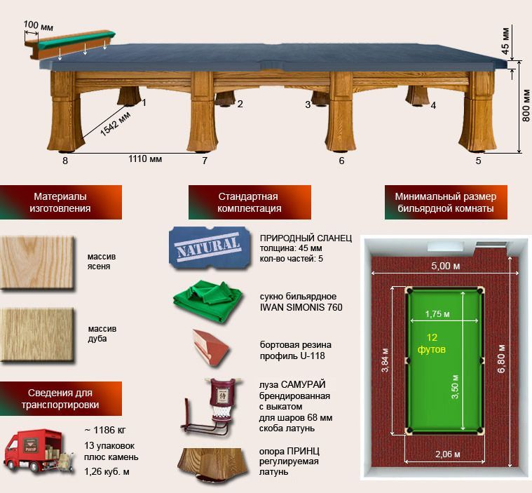 Спецификация бильярдного стола «Барон» 12 футов: